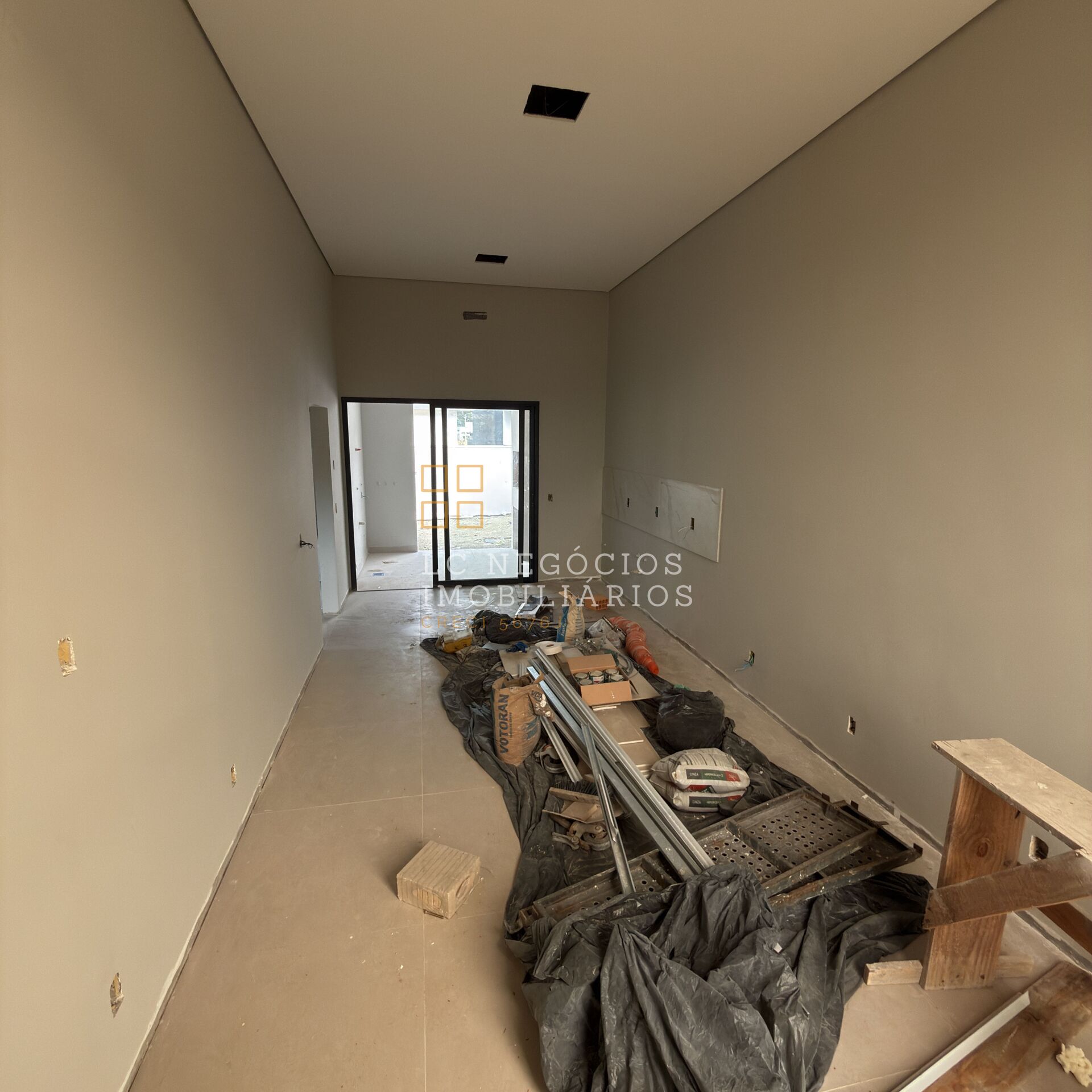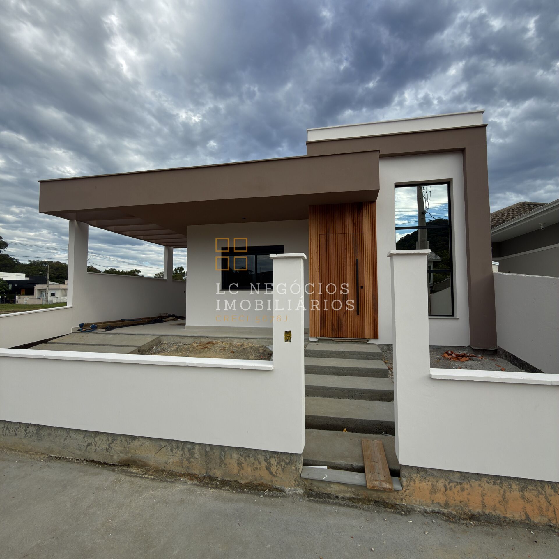 O imóvel conta com telhado oculto, esquadrias de alumínio na cor preta com persianas automatizadas nos quartos, piso vinílico amadeirado nas áreas íntimas e porcelanato retificado nos demais ambientes. Os banheiros possuem acabamento completo em porcelanato, com nichos embutidos e louças já instaladas.